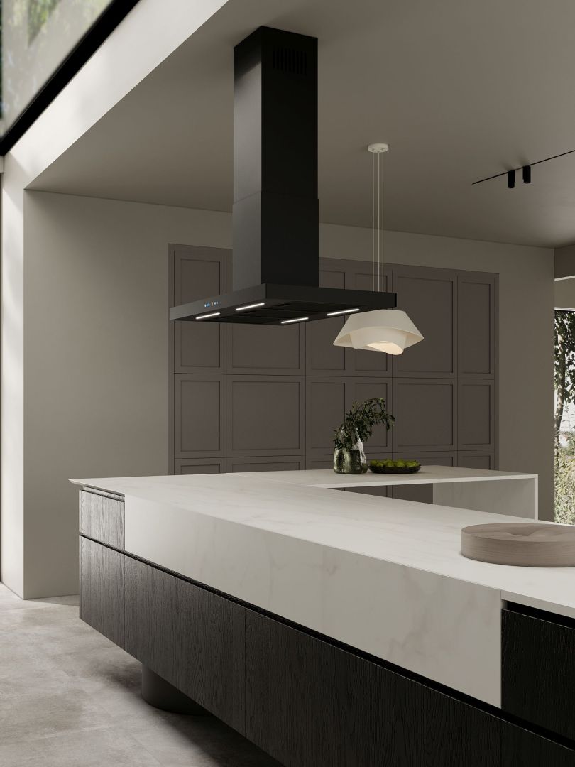 Designer-emhætter bør også have interessante, avancerede og samtidig intuitive betjeningselementer. Sento Island Strips Black Matt har netop det: et baggrundsbelyst touchpanel, en indbygget timer til automatisk slukning af emhætten, fire-trins blæsermotorstyring og en kompakt fjernbetjening som standard.